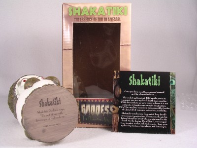 | This is a fun Shakatiki from Harmony Ball Company! These vessels are designed by Tony Jacob, famous for his art of everything Tiki. Shakatiki vessels have many decorative and functional uses. They especially love flowers (use as a vase), but they don't mind acting as a pen holder or other practical container. Most of all, they wish to put you in a South Seas state of mind. Approximately 6 1/4" tall. This one is titled 'Goddess'. Item number: TKGO. New in the box-pictured! Fun as a gift or for yourself.