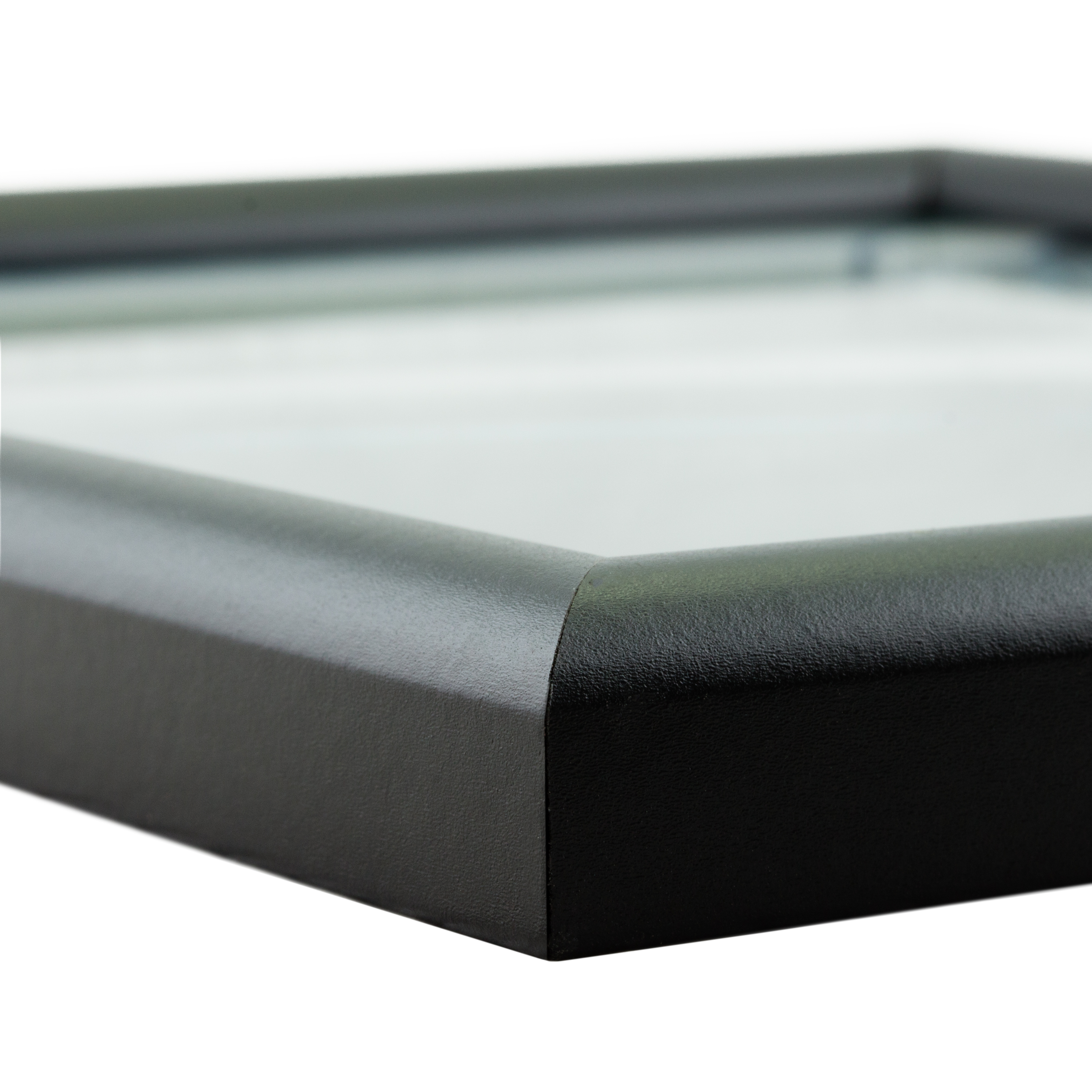 - Frames smaller than 12×18 come with glass facing and rigid black backing with two (2) attached hangers. Frames 12×18 and larger come with .050 acrylic facing and rigid cardboard backing with hanging hardware.