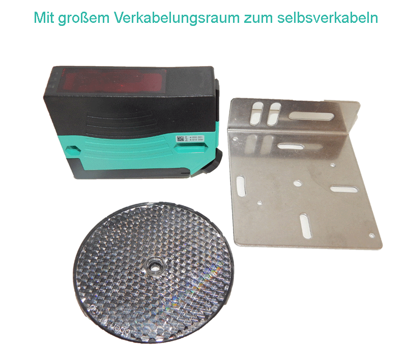 Set bestehend aus Sender/Empfänger (in einem Gehäuse) mit Klemmraum, Edelstahl-Haltewinkel sowie einem Rund-Reflektor mit 84mm Durchmesser