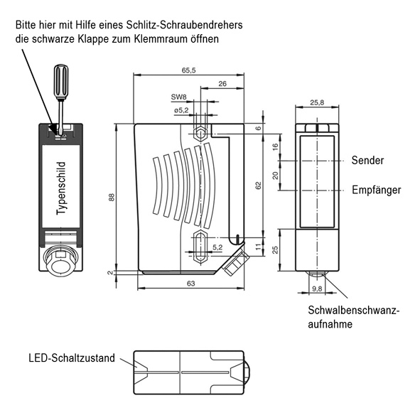 - 3. LED aus: bei Strahlunterbrechung = Lichtschranke und Reflektor nicht bzw. falsch ausgerichtet oder Hindernis im Lichtstrahl