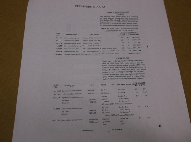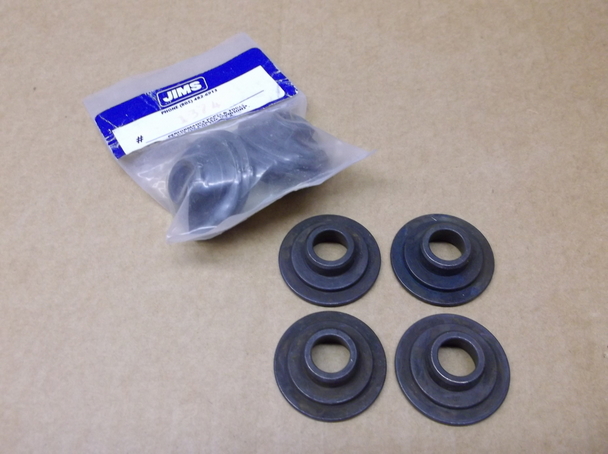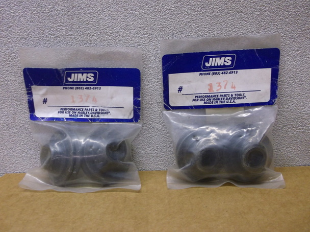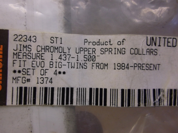2 Sets Jim's #1374 Chromoly Double Spring Collars for 1984-2004 Harley Big Twins The Product: Two sets of Jim's #1374 chromoly double spring collars for 84-04 Harley EVO and Twin Cams. These have a lock angle of 10 degrees, fit all stem sizes and fits springs with diameters ranging from 1.437"-1.5". Research: We found these listed in the 2013 Jim's catalog on the Rollies Speed Shop website which is where we acquired the information listed above. If you are unsure if these will fit your motorcycle we suggest you contact your local Harley dealer or Jim's directly. Layout of pictures: The first three pictures show various views of the collars. The fourth picture shows the label on the packaging where you can see Jim's part number 1374. The fifth picture shows the listing for the collars in the Jim's catalog where you can see the matching part numbers. Please take a close look at the pictures and review our return policy below prior to making a purchase. Condition: These collars are new and in great shape aside from some light rub marks caused by the packaging rubbing against the components. |
