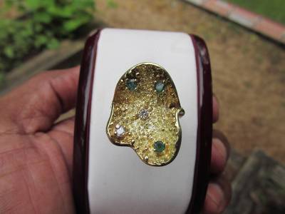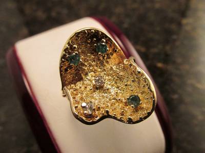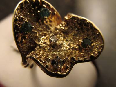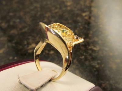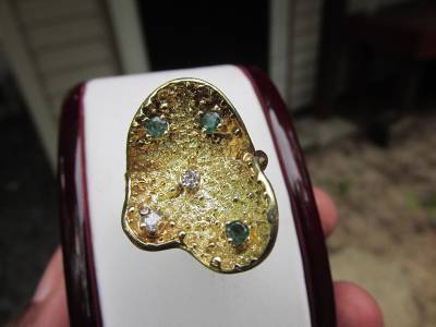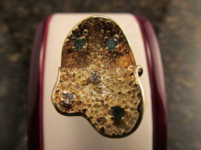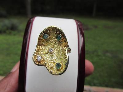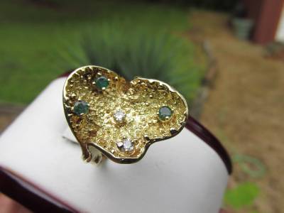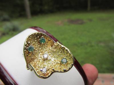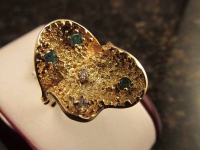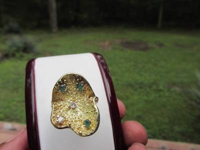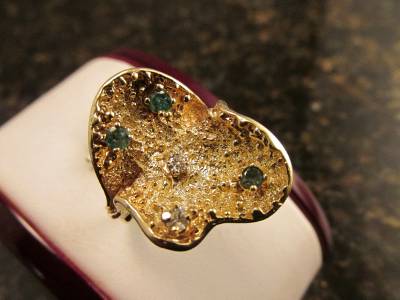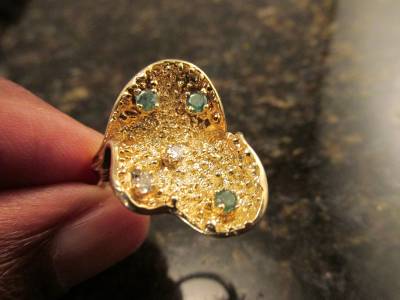 DescriptionOffer Up For Sale Is This Vintage Retro Design Ring Made Of 14k Solid Yellow Gold With Diamonds And Emeralds. This Beautiful Piece Is A Work Of Jewelry Art And Will Make A Great Gift Or Addition To Any Fine Jewelry Collection. Ring Is Hallmark 14K And Is A Size 6.25 And Can Be Resize Easily.