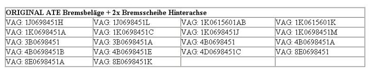 Original ATE Bremsscheiben:| Bezeichnung | Motorisierung | Baujahr | KW | PS | ccm | KBA | Einschränkung |