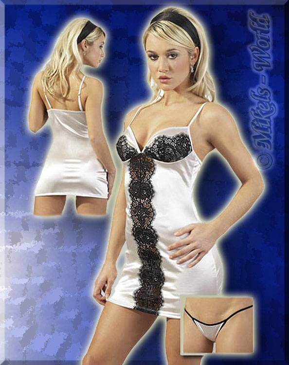 Der ultimative Dessous-Traum für jede Frau! Dieses hocherotische Satin Negligé ist mit viel Liebe zum Detail gearbeitet und verführt durch seinen aufregend schillernden Silberglanz kombiniert mit schwarzer, hauchzarter Spitze. Das wunderschöne Mini Kleid besticht durch seine spitzenbesetzten, abgenähten Cups, die den Busen raffiniert akzentuieren und ein umwerfendes Décolleté zaubern. Der transparente Spitzeneinsatz in der Front streckt die Figur und gewährt aufregend tiefe Einblicke. Die schmalen verstellbaren Spaghetti-Träger sorgen für einen idealen Sitz. Ein passender silberglänzender String greift das extravagante Edel-Design perfekt auf und vervollständigt das sexy Set in Vollendung. In diesem unwiderstehlichen Luxus-Set im Glamour-Look steht einer romantischen Verführung nichts mehr im Wege ;-)))Andere Artikel aus dieser Kollektion findet ihr auch hier in unserem
