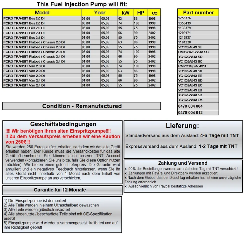 | FORD | TRANSIT Platform/Chassis (FM_ _, FN_ _) | 01/2000 - 05/2006 | 2.4 DI (F_A_, F_B_, F_C_, F_D_) | 55/75 | F4FA |