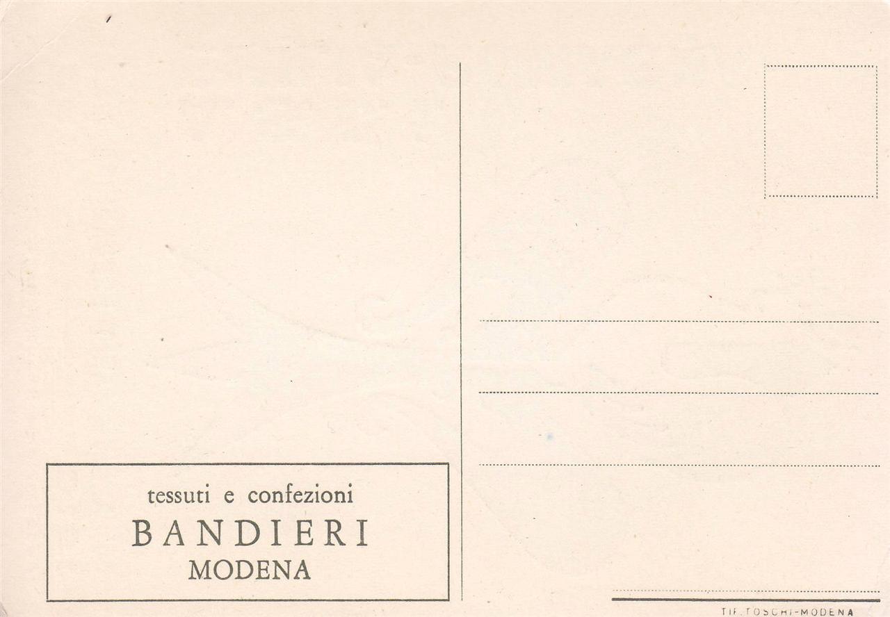 CARTOLINA FORMATO GRANDE NON VIAGGIATA. AL VERSO PUBBLICITA' "TESSUTI E CONFEZIONI BANDIERI MODENA". PICCOLE PIEGHE AGLI ANGOLI. Il materiale è autentico, originale dell'epoca e nelle condizioni mostrate dall'immagine.