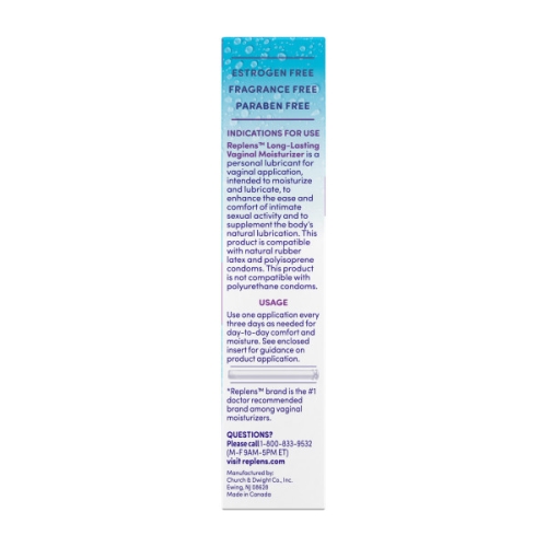Helps replenish vaginal moisture. Supplements the body's natural lubrication. Long lasting formula. Estrogen free. Fragrance free. Vaginal dryness can be a serious problem for women of menopausal age and beyond, new mothers, cancer/chemotherapy patients and women with dryness due to medications, stress or tampon use. Replens helps replenish vaginal moisture and provides long-lasting results. Comfortable applicator delivers just the right amount of Replens Long-Lasting Vaginal Moisturizer to provide vaginal moisture at the source of discomfort. The patented formula keeps Replens in place to deliver moisture for long-lasting hydration with less mess. Replens is compatible with natural rubber latex, polyisoprene, and polyurethane condoms.