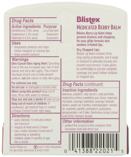 Seals in moisture. To soothe & prevent dry lips. Smooth easy-gliding protection. Blistex Berry Lip Balm helps prevent dryness and chapping. Its easy glide formula also soothes irritated lips. Dry, Chapped Lips: Blistex Berry Lip Balm has three long-lasting protectants, and it seals in lip moisture to prevent drying of lip tissue. Blistex Berry Lip Balm glides on comfortably to provide complete coverage and avoid further irritation of chapped lips. Sun Protection: Blistex Berry Lip Balm provides SPF 15 protection, which is recommended even for people who burn easily and tan minimally. The liberal and regular use of this product may help prevent premature signs of aging, freckling, uneven coloration and possible cancer-causing effects of overexposure to sun. Remember, lips don't tan, but they do burn.