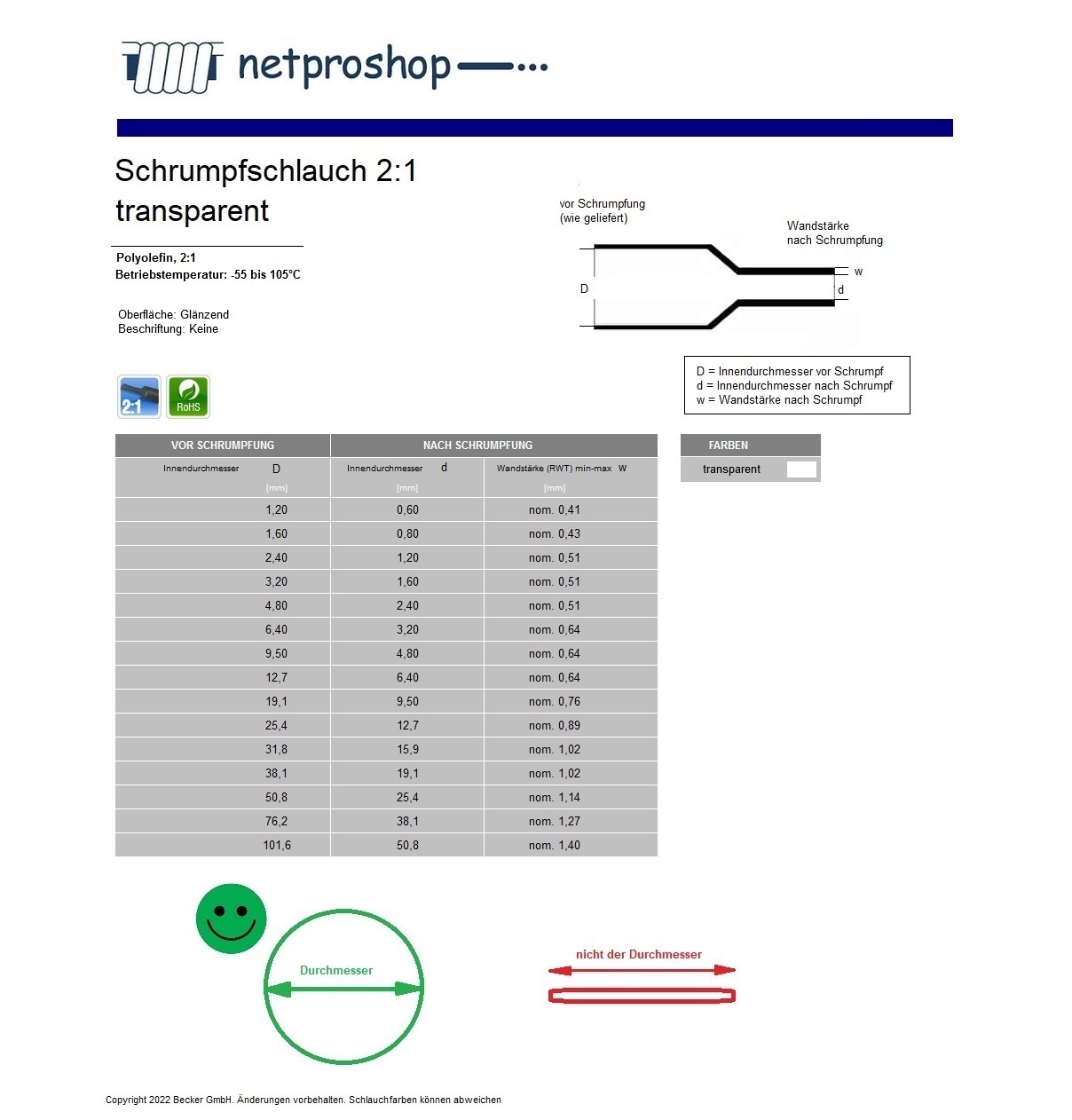 Technische Details: dünnwandiges, strahlenvernetztes, flexibles Polyolefin - brennbar - RoHS konform - Schrumpfverhältnis: 2:1 ( 50%)