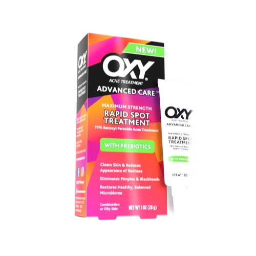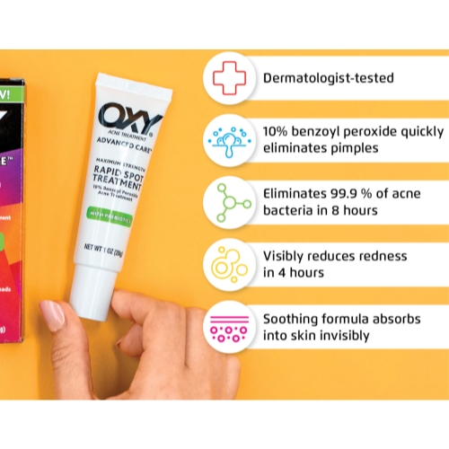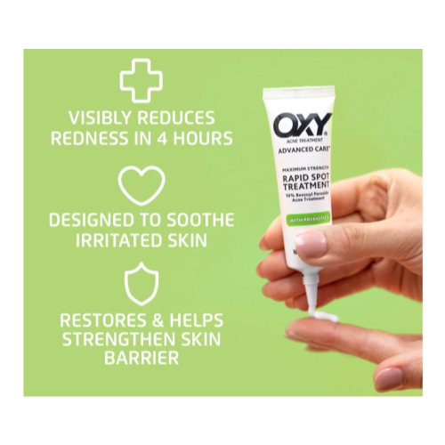 Fight acne effectively and easily with OXY® Maximum Strength Rapid Spot Treatment. Eliminating 99.9% of acne bacteria in just 8 hours, this acne cream contains maximum strength 10% benzoyl peroxide, the #1 over-the-counter ingredient recommended by dermatologists for treating acne. Its patented skin soothing agent helps minimize irritation on your face while boosting skin cell renewal. Tested by dermatologists, this oil-free benzoyl peroxide acne treatment visibly reduces redness in just 4 hours. Rely on clinically proven OXY® Rapid Relief Acne Spot Treatment to attack acne blemishes and help keep your skin clear. Use only as directed.