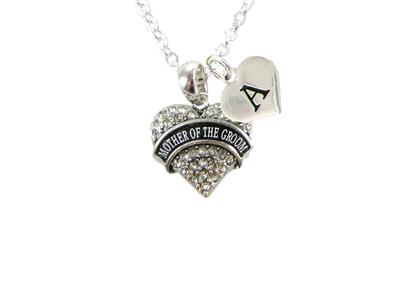 Customize this beautiful crystal mother of the groom heart necklace with her initial in a silver heart charm. Makes the perfect gift for that special lady to remember your wedding day and the customization gives this necklace the perfect touch of personalization. You can buy this item along with items for the rest of your wedding party!