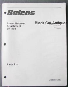Up for sale, we are offering an original, 1988, Bolens, 38" Snow Thrower Attachment parts list for model 30138 - serial number 0100101 thru 0499999, Form P3975-4. Included in the parts list, is an exploded view diagram and corresponding parts list. Please enlarge the pictures for a closer look.