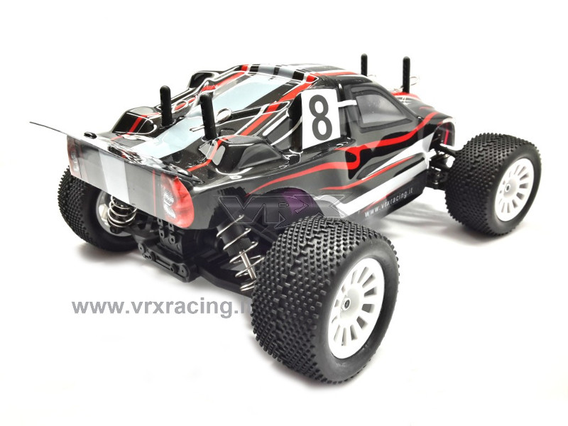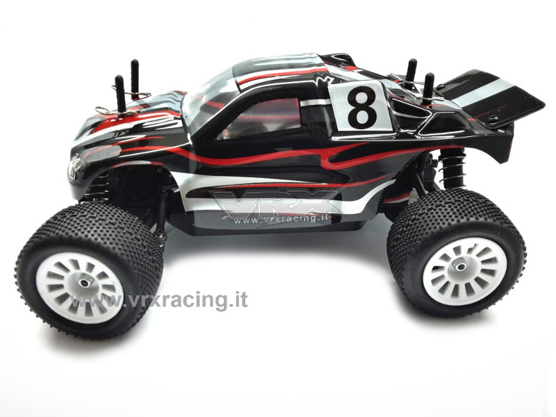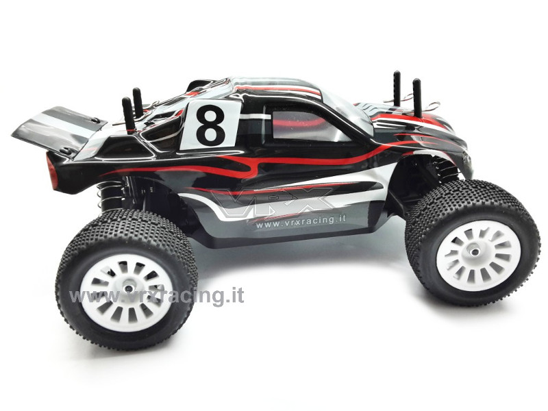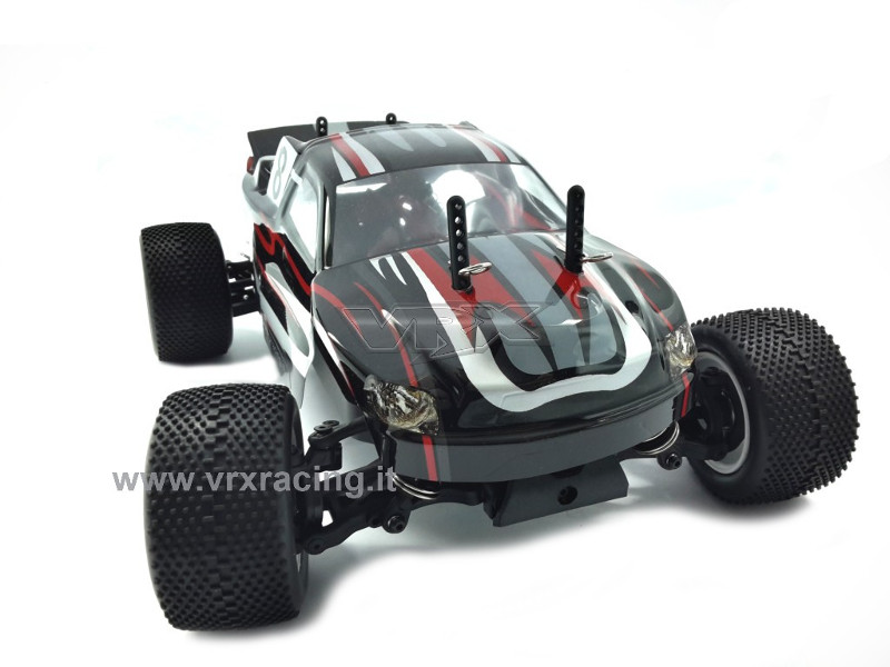 ST-BL è il nuovo Truggy brushless VRX in scala 1/18, RTR a quattro ruote motrici. L'ST-BL a differenza dello stesso modello con motore elettrico a spazzole, è spinto da un potente motore elettrico brushless KV4200, gestito da un'efficiente esc brushless da 20A. Alimentato da una batteria LIPO 7,4V da 1300MAH, completo di caricabatteria lipo con bilanciatore, inoltre la radio a volantino è 2.4ghz , eliminando così definitivamente problemi di interferenze con altri modellisti e/o frequenze radio, e la ricevente 2.4GHz è provvista del failsafe integrato (assicurando l'arresto del modello in caso di perdita di contatto tra radio e ricevente). L'ST-BL è assemblato su un robusto telaio (inferiore e superiore) in nylon, interamente cuscinettato, ed una particolarità di questo modello sono i giunti omocinetici anteriori (introvabili sui modelli di medesima scala), la trasmissione è a cardano con due differenziali (anteriore e posteriore) con copricorona a protezione di corona e pignone.Inoltre sui 4 ammortizzatori ad olio sono presenti 4 punti di attacco (2superiori e 2 inferiori) per variarne l'altezza dal suolo. Anteriormente sullo sterzo è installato un efficiente salvaservo. Insomma una meccanica robusta e compatta in così poco spazio, paragonabile solo a modelli di scala superiore. Disponibile in due colorazioni