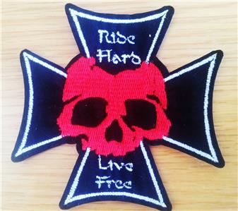 RIDE HARD LIVE FREE SKULL IRON ON SEW ON EMBROIDERED PATCH 8cm x 8cm BIKER MC