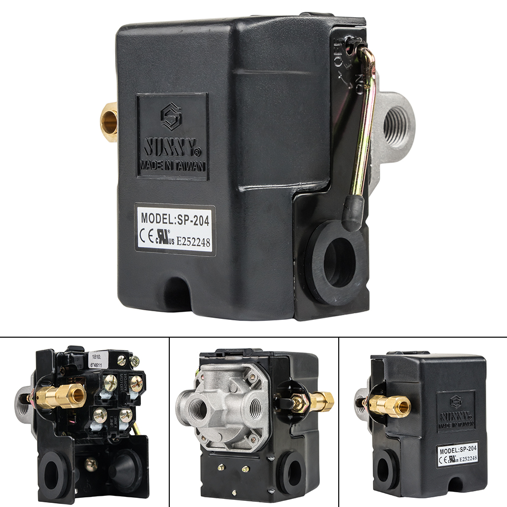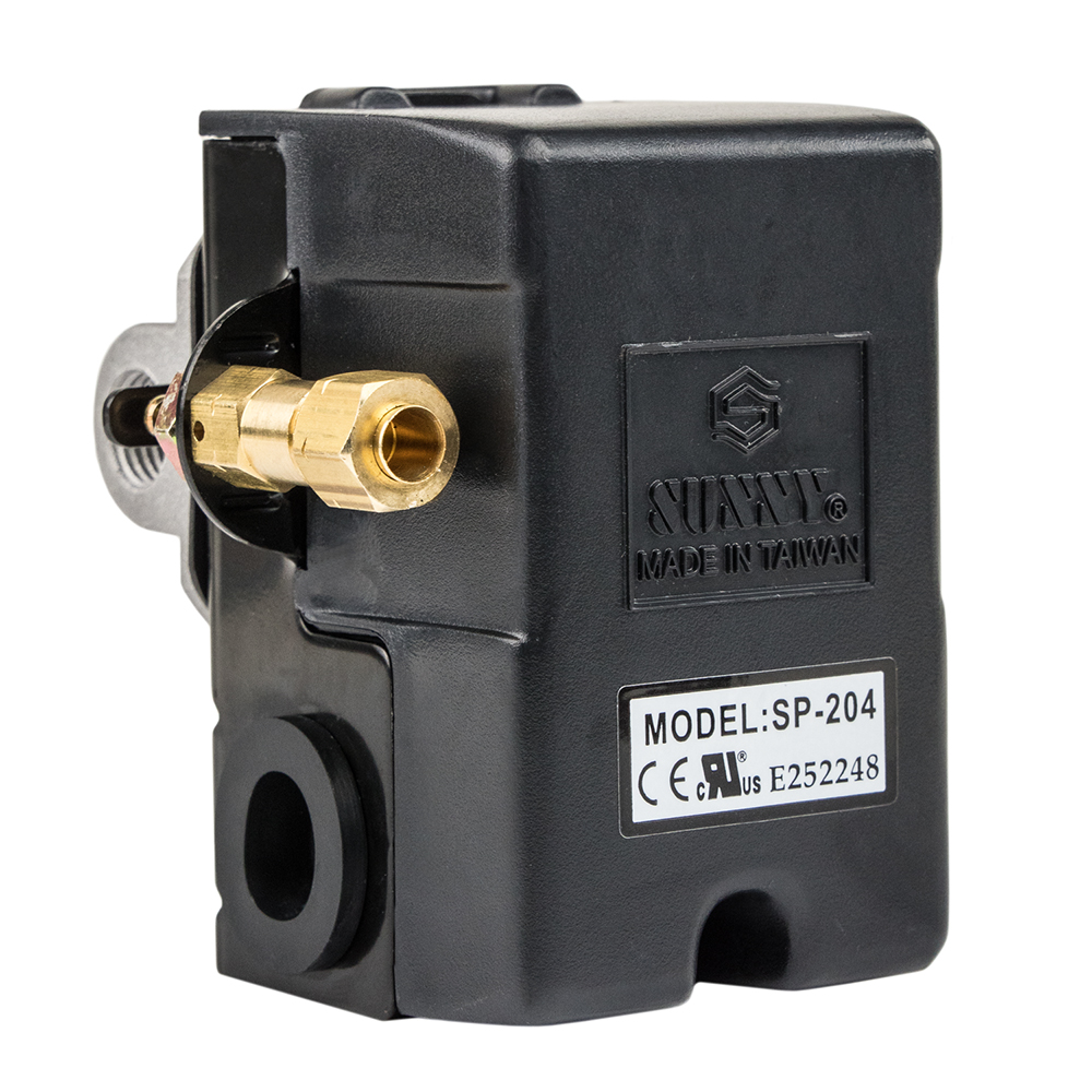 25 Amp heavy-duty air compressor switch. If the switches you have been using are burning out and melting contacts, this is a great high-quality heavy-duty replacement switch! This switch is rated at 25 Amps at 115V, 230V, and 12V DC power. The switch is set to turn on at 95 PSI and turn off at 125 PSI. The pressure settings are adjustable 30-40+- PSI. This switch comes equipped with and on/off switch and also an unloader valve which can or cannot be used depending on what your compressor calls for. This is a universal switch commonly used as a replacement / upgrade with Furnas, Square D, Sunny, Lefoo, and many more compressors! This will work as long as the pressure settings are correct or close enough to adjust the switch to the exact pressure you use. This switch requires one 1/4" air inlet from the tank. The manifold on this switch features four 1/4" inlet/outlets. We also have single port pressure switches available in our store.