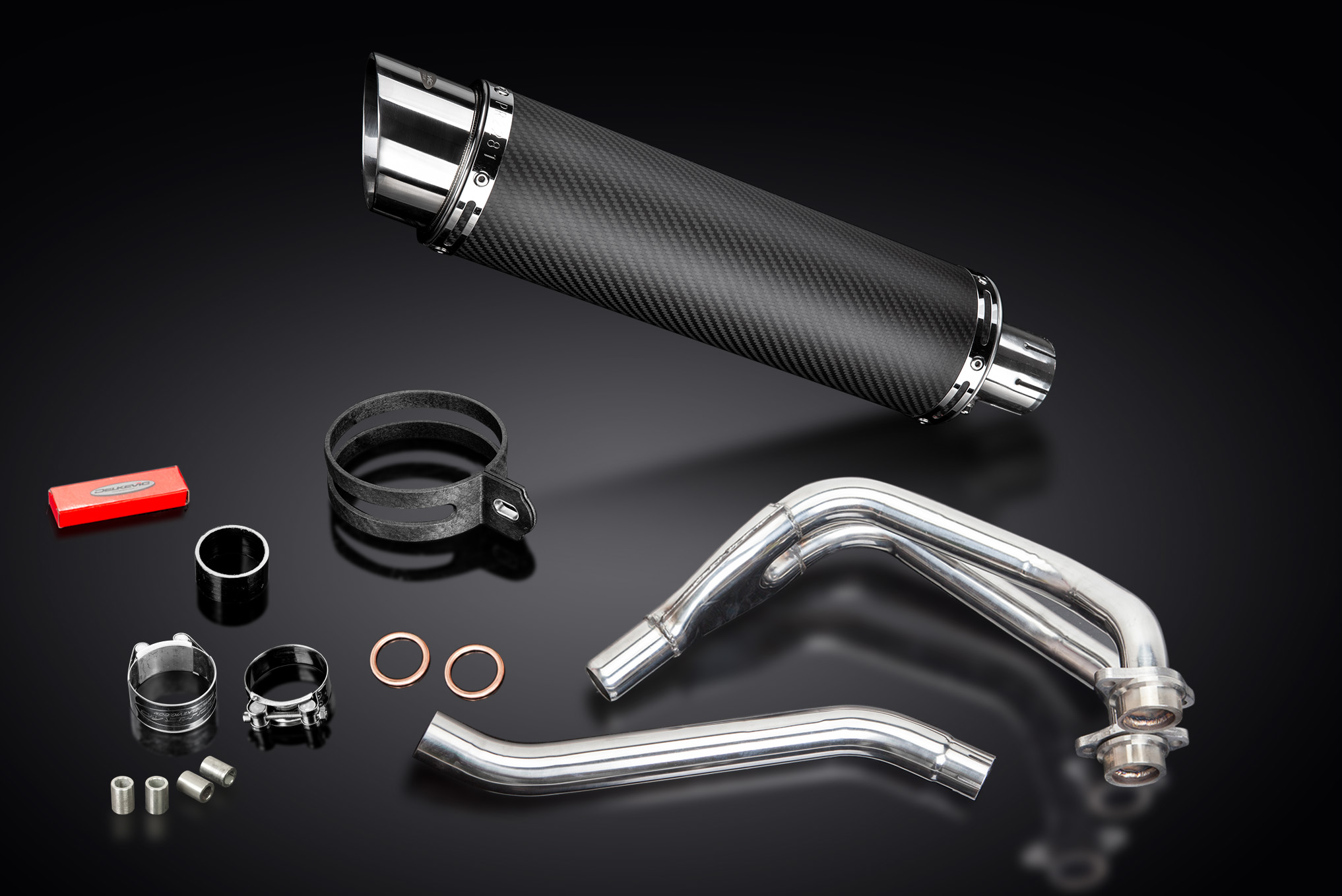 - This set includes - Delkevic down pipes, link pipe, silencer with a removable baffle, strap, clamps, gaskets, and spacers.