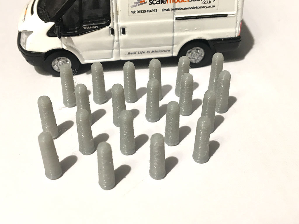 A pack of 20, high quality 3D printed concrete bollards in OO / 1:76 scale. Supplied unpainted and printed in grey eco-friendly PLA. Can be quickly and easily painted with acrylic paints.