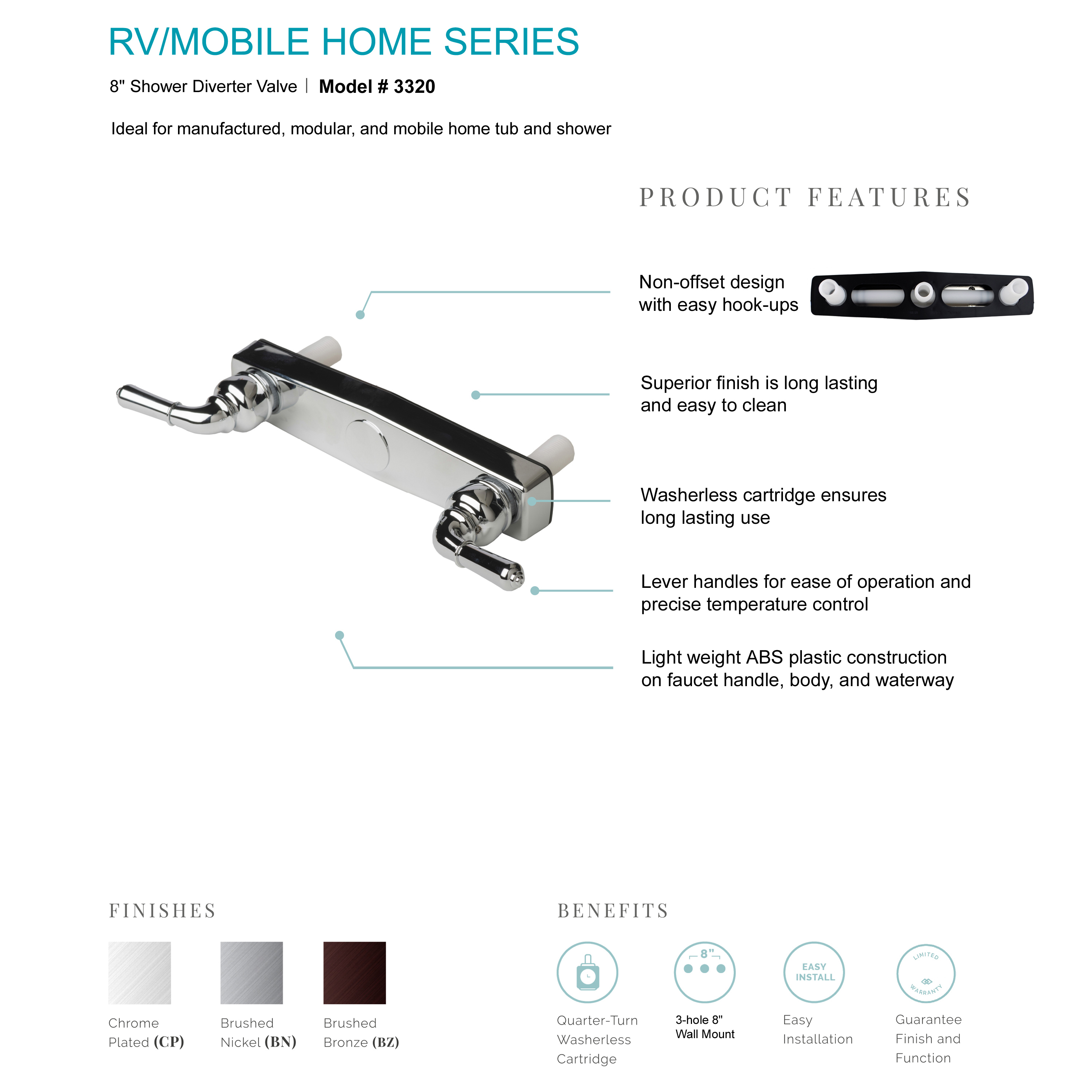 RV/Mobile Home Series model # 3320BN. Brand new non-metallic two handle 8" shower only valve. Premium quality. 3 hole installation ideal for manufactured, modular, and mobile home.