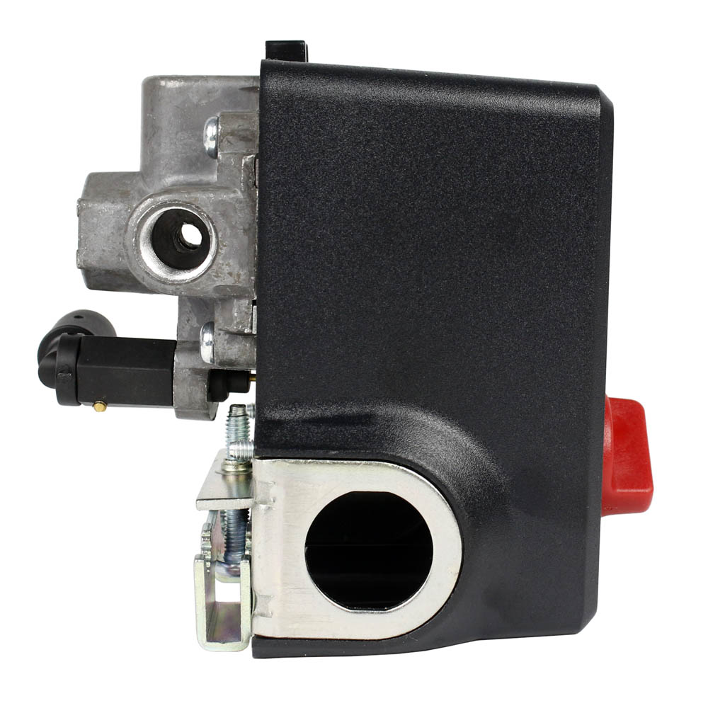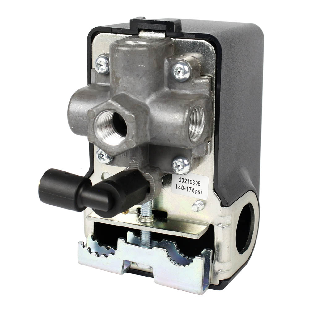 Import style 140-175 PSI air compressor, pressure switch, control valve with a four port connection manifold. The switch listed is a universal replacement pressure switch that replaces import syle, Condor brand and more. This switch is equipped with an unloader valve, an on / off pressure control button, and a four-port mounting manifold.