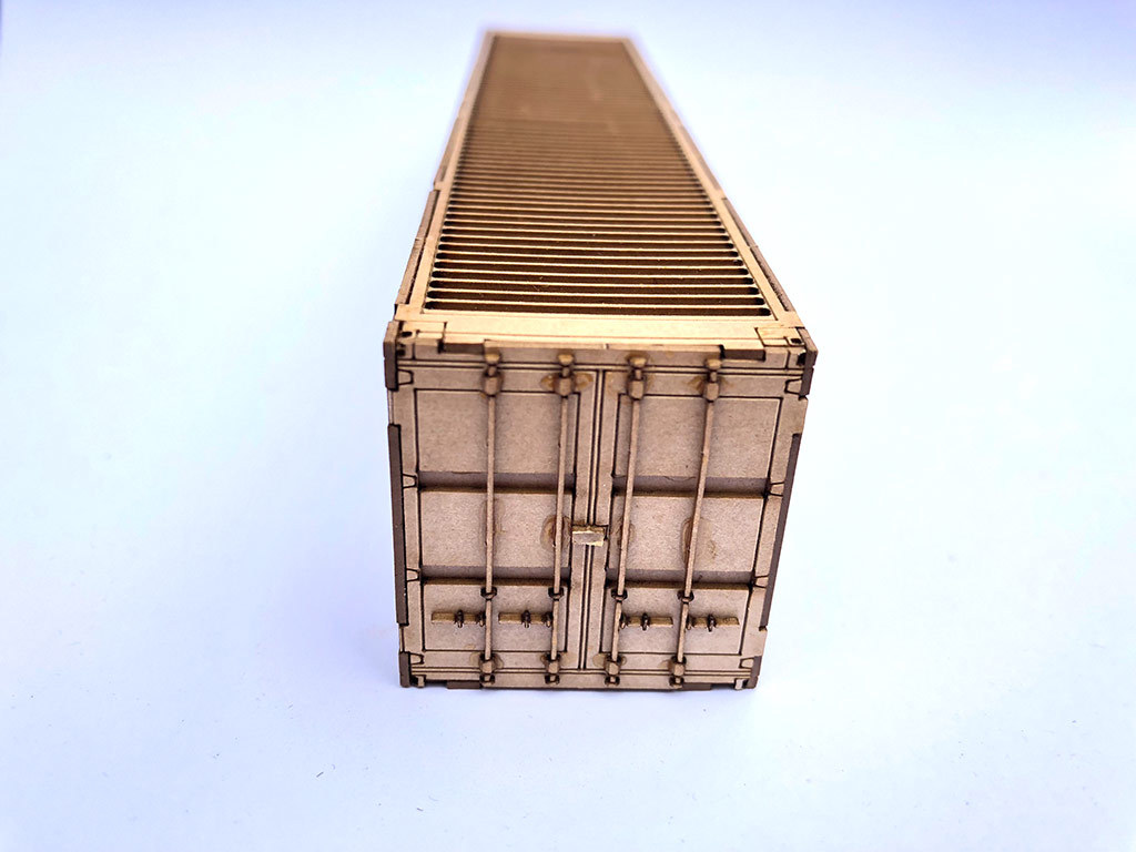 A pack of 2 laser cut, self-assembly, 40ft shipping containers for OO gauge model railway layouts and 1:76 scale diecast dioramas. Easy to assemble layered box construction & packed with lots of detail including door locks.