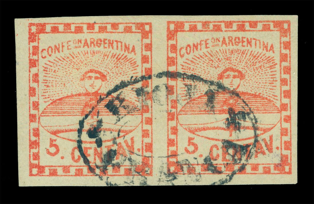 ARGENTINA 1858 Confederation 5c red Scott #1 used XF PAIR - "RIOJA FRANCA" cancel - RARE