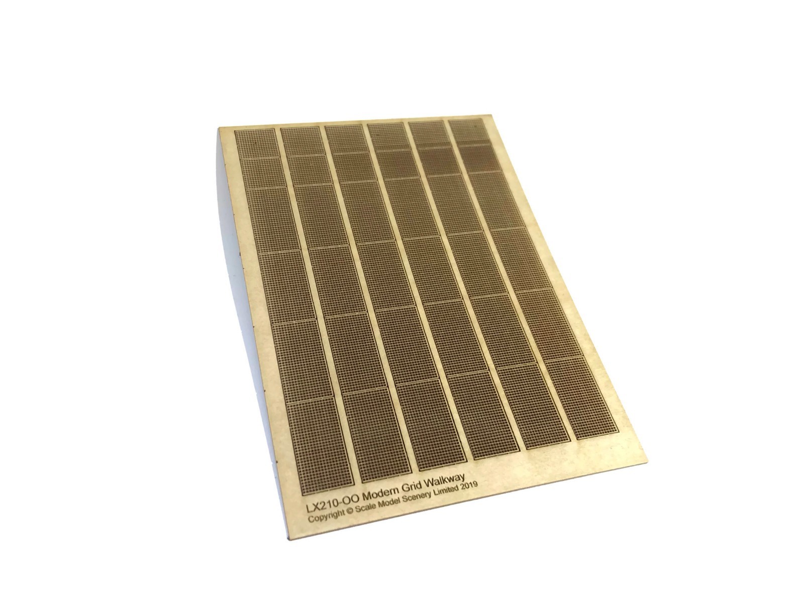 A versatile pack of walkway grating for your modern image TMD or depot on your OO / 4mm / 1:76 scale model railway layout. Builds up a total of 75cm of walkway, with highly detailed laser cut grid for the most realistic effect possible. Designed for use along the side of the track, but will also fit between the rails in both directions with combination of square and rectangular sections to mix and match as you please.