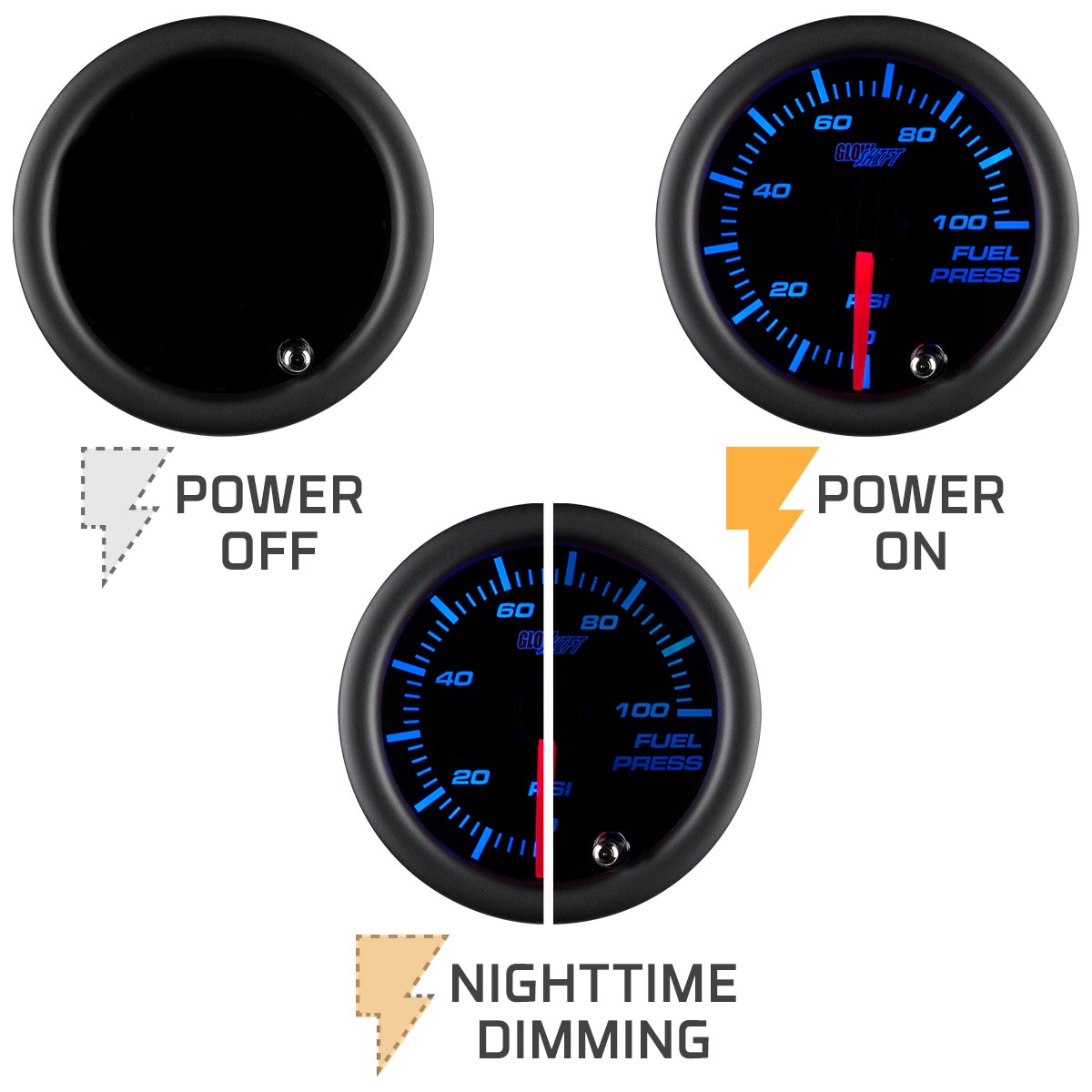 GlowShifts Tinted 7 Color Series 100 PSI Fuel Pressure Gauge gives you the ability to monitor fuel pressure levels from 0 to 100 PSI in the gas or diesel engine of your car or truck. Having this gauge will help ensure that your vehicles fuel pressure is running at optimal levels, and is not too low which could result in loss of horsepower or damage to your fuel pump or injectors. Parts required for installation are also covered with accessories including a fuel pressure sensor, wiring harnesses and mounting hardware.