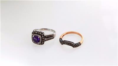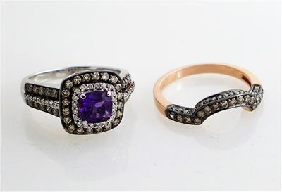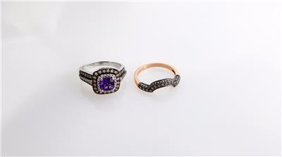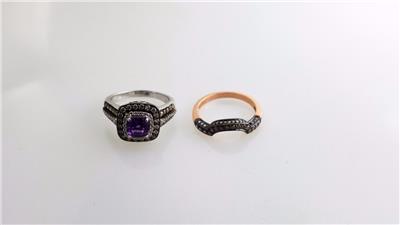 Gold Coast Jewelry presents this gorgeous set of LEVIAN 14KT GOLD AND DIAMOND RINGS. One LeVian ring features an amethyst surrounded by clear and chocolate diamonds set in 14kt white gold and the other Levian ring (enhancer) features chocolate diamonds set in 14kt rose gold. The total weight of both rings is about 10.7 grams. The retail on the 14kt white gold diamond ring is $1999.00 and the other is about $1398.00. Please view the attached photos and also View My Other Items For Sale. Thank you.
