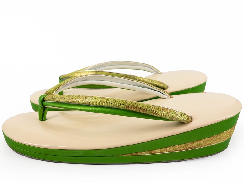 This is a lovely pair of Japanese zori for use when wearing kimono. They are in lightly worn condition with a lovely antique look. The bottoms are leather but I am not sure of the tops however they seem to be of fine quality. They are a lovely vintage cream color with gold and green accents and come in their original box. Size: 23cm