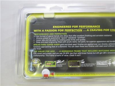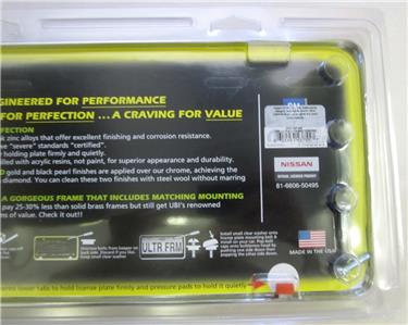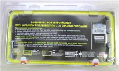 Brand new factory sealed Nissan Infinity Q60 Polished Chrome License Plate Frame Official Licensed Product. Made by Universal Brass Auburn Wa, Logo Accents. High quality item with all mounting hardware and logo screw caps. Has a special hidden locking mechanism for the bottom attachment. Should fits all standard sized license plates and comes with installation instructions. See instructions to make sure this item fits your intended wants, needs and use.