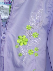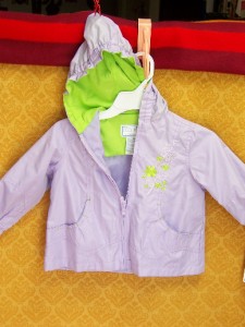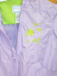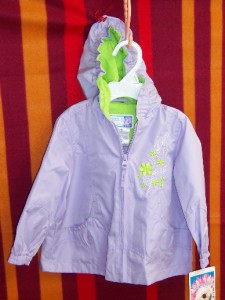 Here's a lovely lavender rain coat that your little girl will love. Izzi Kids jacket will keep her stylishly warm, dry, & comfortable while muddling through puddles and rainy weather this year. Coat has a hood, 2 pockets, zipper front, hook-hang loop, & green decorative floral embroidery and hoody lining.