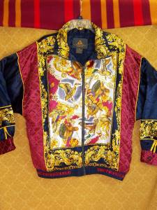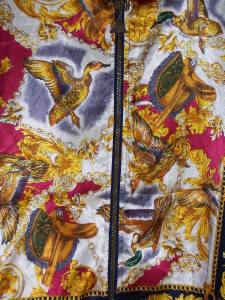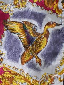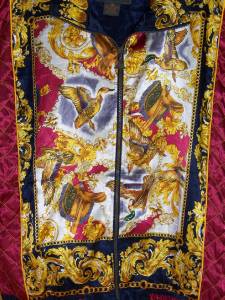 Look like Chinese royalty with this elegant jacket--even the emperor would savor the Peking duck design. The front panel of this multi-colored jacket has a sophisticated, eleborate design in gold, silver, maroon, navy, & white featuring ducks and a gold-leaf motif.