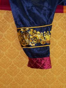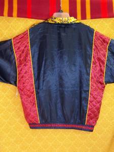 Framing the elegant, gold-toned duck design are maroon quilted side panels offset by gold stitching. Maroon side panels wrap around the sides to the back--which is navy in color.The navy sleeves have a gold-leaf motif hemmed in by gold piping; maroon cuffs are made in the same quilted style as the side panels using gold stitching. When folded down, the collar shows the gold-leaf motif; when zipped up, it creates the look of a navy blue neckband.