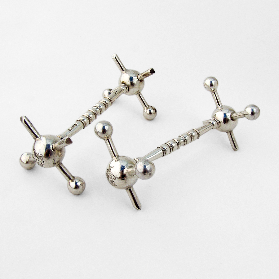 English sterling silver pair of knife rests by Walker & Hall, Sheffield, 1899.