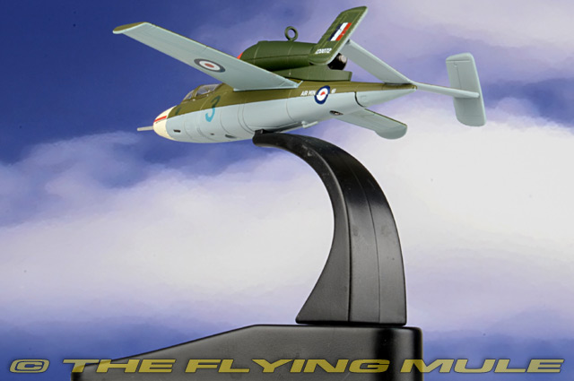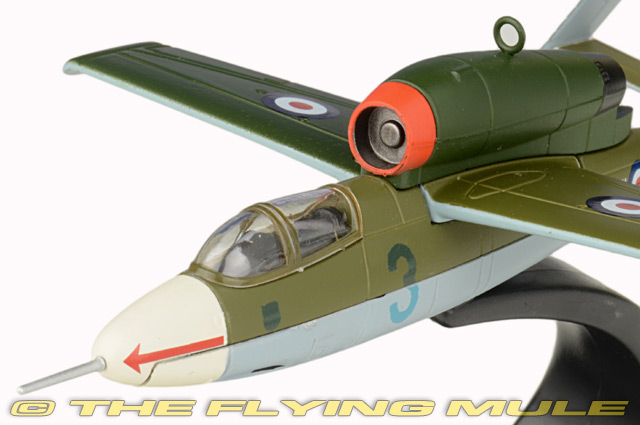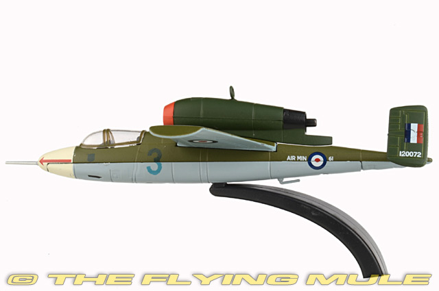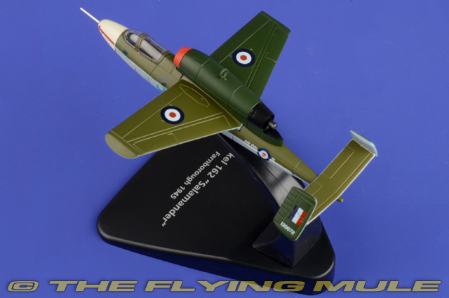 This model is based on a Salamander handed over to the RAF by the Luftwaffe after their surrender in May 1945, Nr. 120072. As with all such aircraft, they were evaluated by Allied pilots, in this case Eric "Winkle" Brown who announced that it was had the lightest and most effective aerodynamically balanced controls that he had ever experienced. However, there was a persistent flaw with the He 162 Salamander in the potential weakness of the rudder. He passed on this information to RAF pilot Flt Lt R A Marks. However, the warning went unheeded and on 9th November 1945, during a demonstration flight at RAE Farnborough, part of the rudder and tail fin broke off and the plane crashed killing both the pilot and a soldier on the ground. This replica is a reminder of that fatal day and is decorated in two tone dark green to the upper wings with a blue grey underside and an off-white nose cone. The RAF Number 120072 is printed on the tail fin and the aircraft features the RAF roundel on the upper and lower wings and along the rear section of the fuselage. With a dark grey interior, the model is rounded off with a transparent cockpit hatch. There are still several He 162 Salamanders in existence, displayed at aircraft museums across the world, including the UK. Heinkel He 162 VolksjagerDesigned as a cheaply and easily constructed jet interceptor, the He 162 was first flown on December 6th, 1944. Developed under the codename "Salamander", the 162 was more commonly known as the "Volksjager" or "People's Fighter". As allied forces steadily impeded the Luftwaffe's ability to counter high-altitude bombers, the 162 was rushed into production as a "disposable" high-speed interceptor, constructed from non-strategic materials by largely un-skilled workers. Despite it's advanced design, numerous issues resulting from its hurried production and late arrival into the war prevented it from realizing its full potential as an effective jet fighter.© Copyright 2003-2026 The Flying Mule, Inc. Oxford Diecast Oxford AviationThe Oxford Diecast "Oxford Aviation" range presents affordable, ready made diecast models of military aircraft.Oxford Diecast "Oxford Aviation" diecast airplanes feature:
