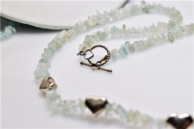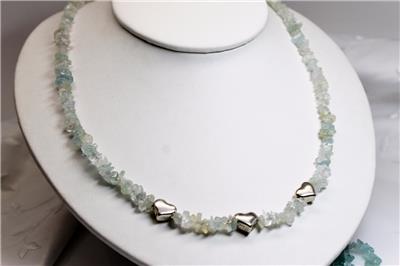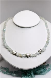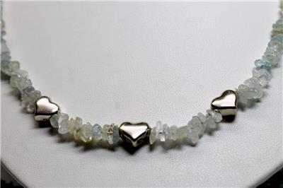 SS GENUINE AQUAMARINE MEDIUM CHIPS & STERLING SILVER HEART BEADS 22" NECKLACE