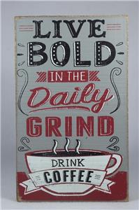 This is a wonderful piece by Demdaco Co. The wooden word block is a terrific piece to set on a shelf or counter, or hang on the wall (the hardware is attached-pictured). The wood with colorful lettering would look terrific with most decor, a simple way to decorate. The block has the following written on it: 'Live Bold In The Daily Grind Drink Coffee'. A terrific word block!