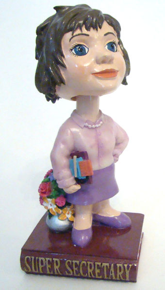 GANZ Bobble Head Super Secretary - Brown Pixie Hair Girl Standing on Book This adorable little brown hair pixie girl stands on a book titled "Super Secretary". Her head bobbles, she is carrying her important notebooks, and a pretty vase of flowers is beside her. This item is brand new from retired stock. The original brown outer box is included and item has original sticker on the bottom. An adorable little decorative item for someone you love!
