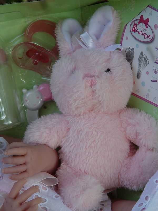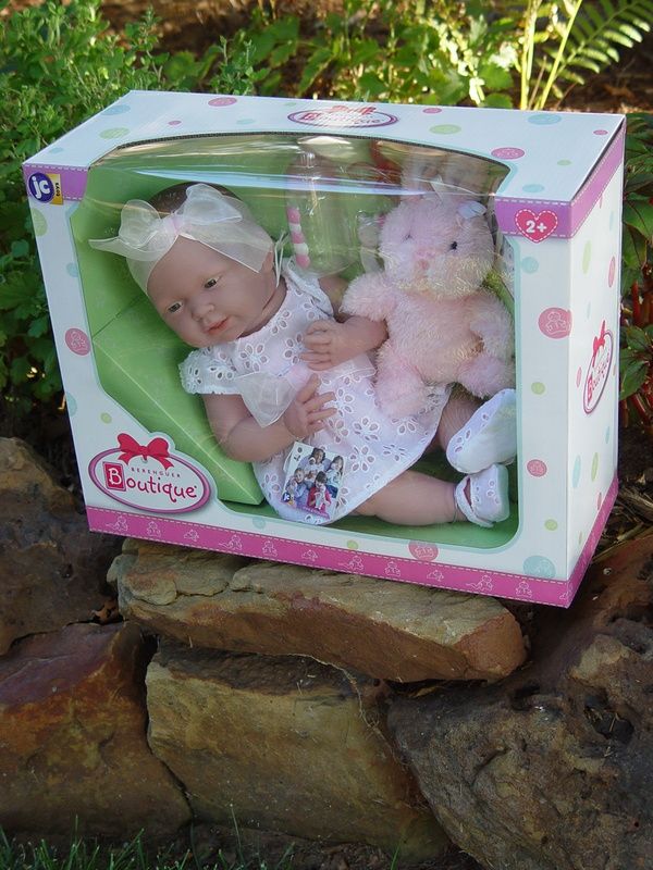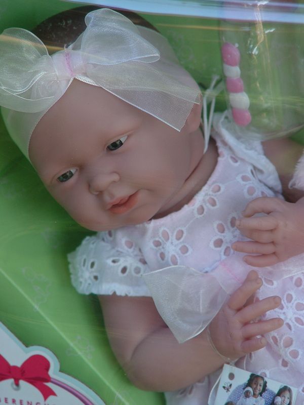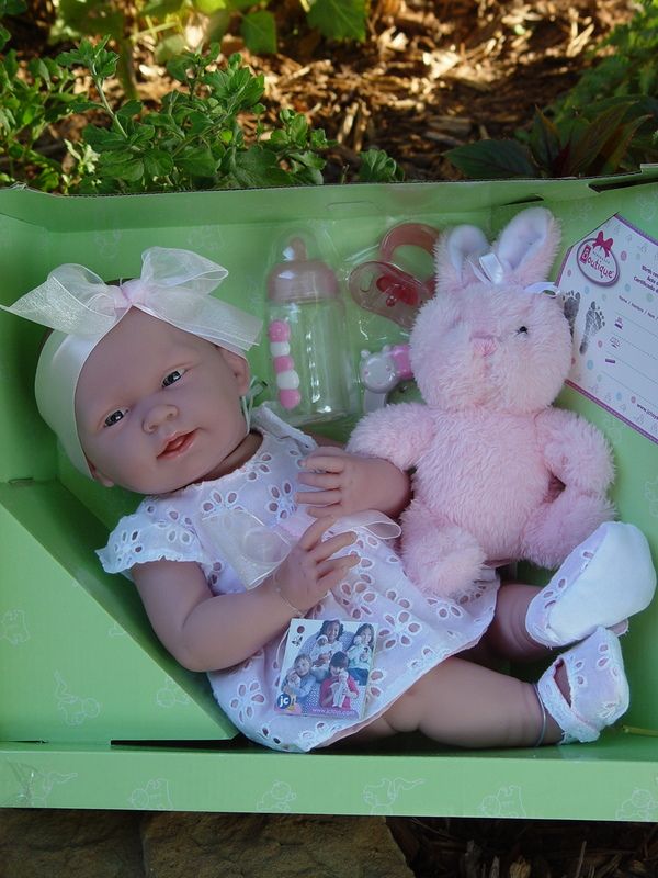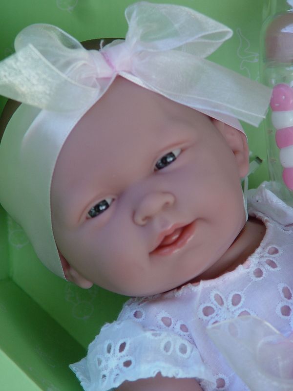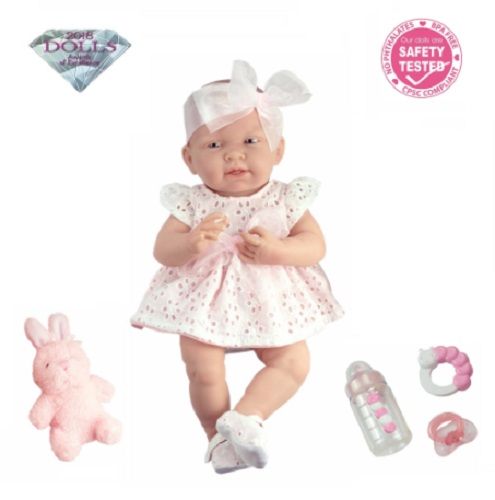 | | | This doll is a 15” vinyl, anatomically correct “real girl” baby-doll with a jointed body that enables her to assume various poses. Designed by Berenguer, she is dressed in a light pink and white eyelet outfit with a big matching bow. Even her shoes are matching eyelet! She has lifelike eyes, an inquisitive expression, and realistic ears, lips, and nose. As part of a Deluxe Gift set, she comes with an assortment of pink-trimmed accessories including; a bottle, rattle, pacifier, and a little fluffy bunny plush toy. The set even includes a birth certificate! This little sweetie is lightweight and easy to carry. Her body is washable and her clothes can be easily removed and cleaned, meaning that she will look new for years! Children will love to take her out and about. Moreover, playing with dolls is an excellent way to teach children about caring for others and basic communication and/or interaction skills. We love to combine shipping whenever possible. Thanks so much for shopping with us!!