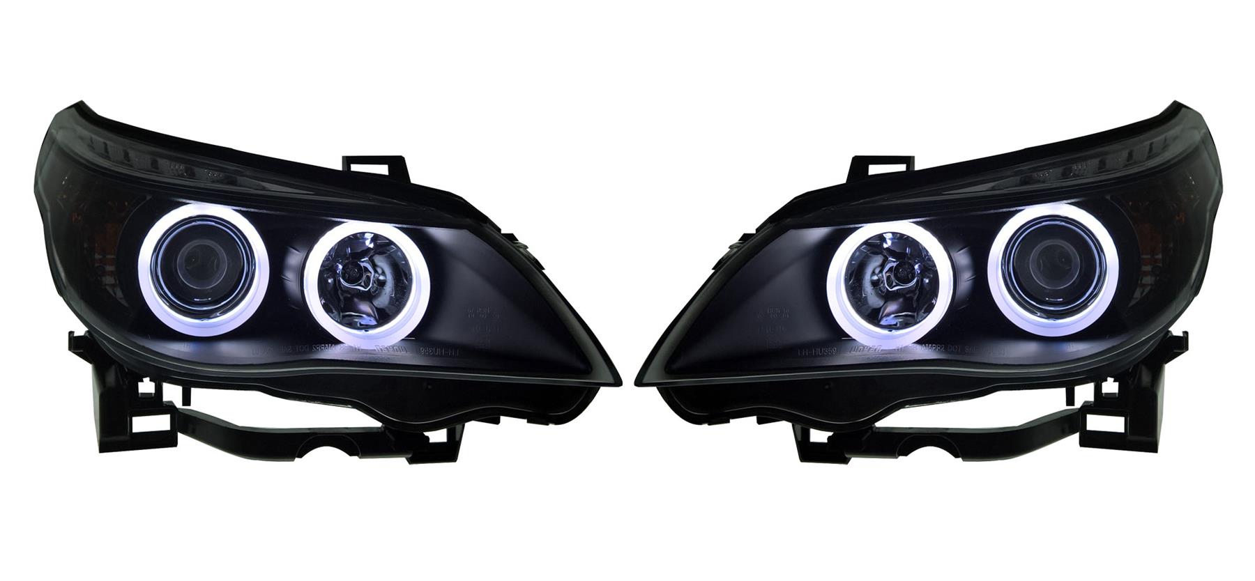 BLACK ANGEL EYE HEADLIGHTS WITH SUPER BRIGHT RINGS & LED RUNNING LIGHT to fit BMW 5 SERIES E60, E61 03-07