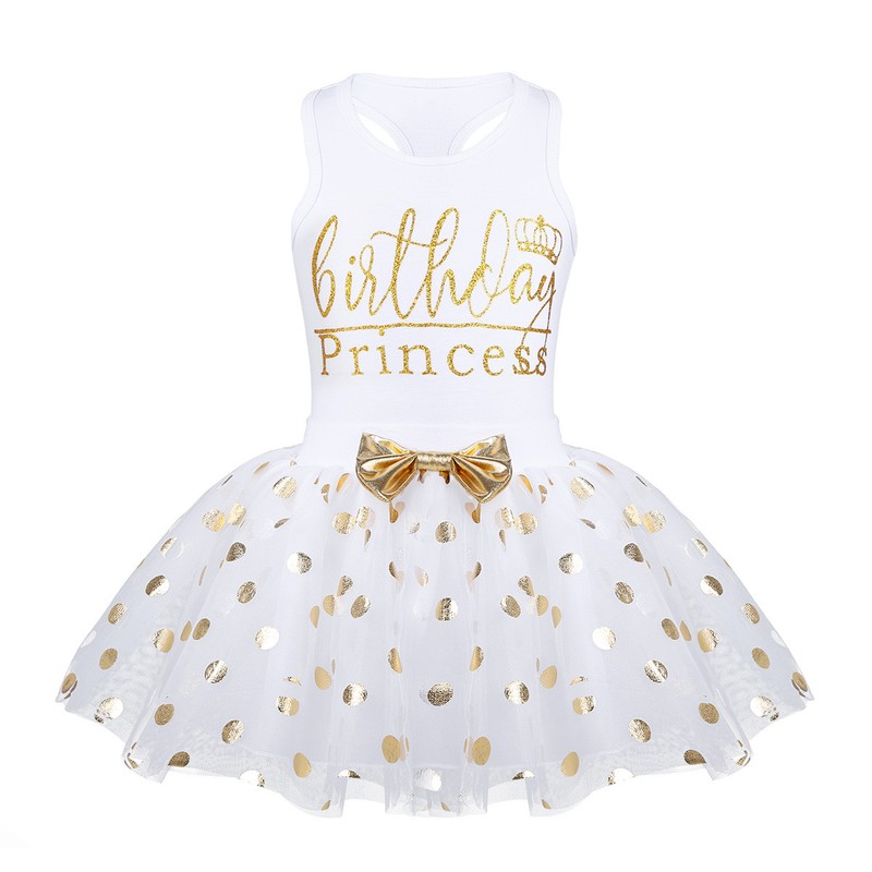 Sleeveless cotton tops, front is printed with glittery letters ’Birthday Princess’ and crown pattern.