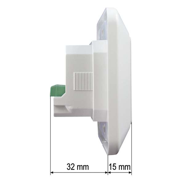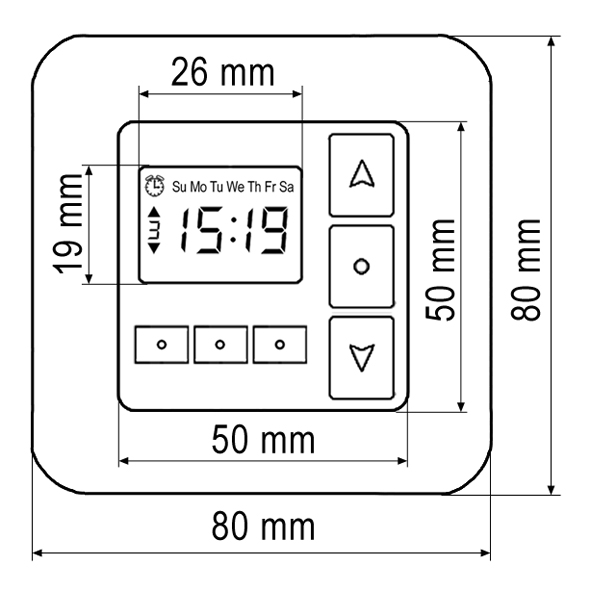 Die Casa Servo besitzt ein genormtes Uhrmodul von 50 x 50 mm. Durch Entfernen des Abdeckrahmens kann die Zeitschaltuhr mit Hilfe eines entsprechenden DIN-Zwischenrahmens ganz einfach in nahezu jedes gängige Marken-Schalterprogramm integrieren werden.