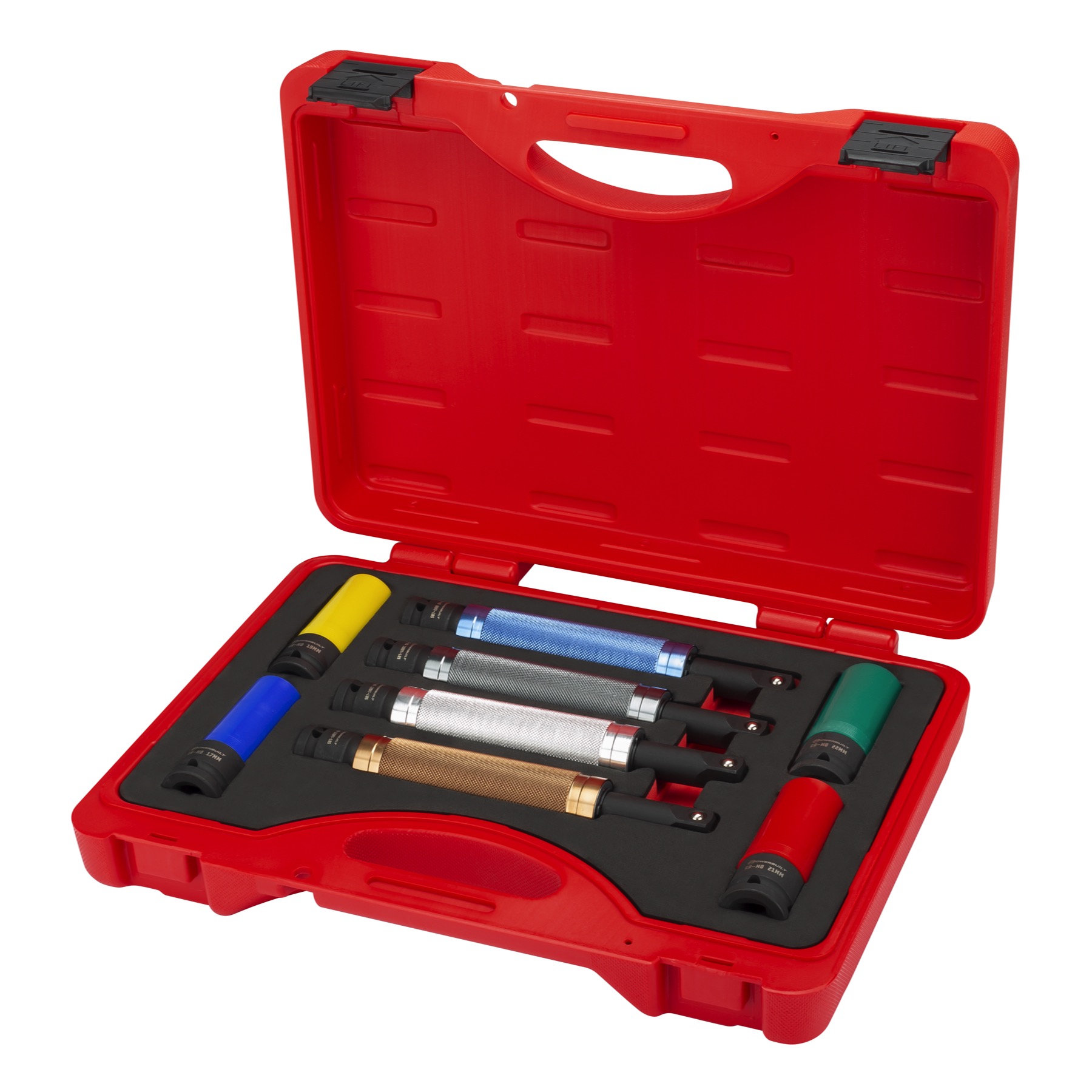 Speed your way through tire rotation and wheel installations with this pro-quality set of torque-limiting extension bars with spinner grip handles and thin wall wheel-saver lug nut sockets with protective sleeves. The 4 color-coded extension bars offer torque presets of 80, 100, 120 and 130 lb.-ft. torque, with free-spinning center grips for secure grip and stability during use. Everything stores in the included carry case for safe storage between uses.