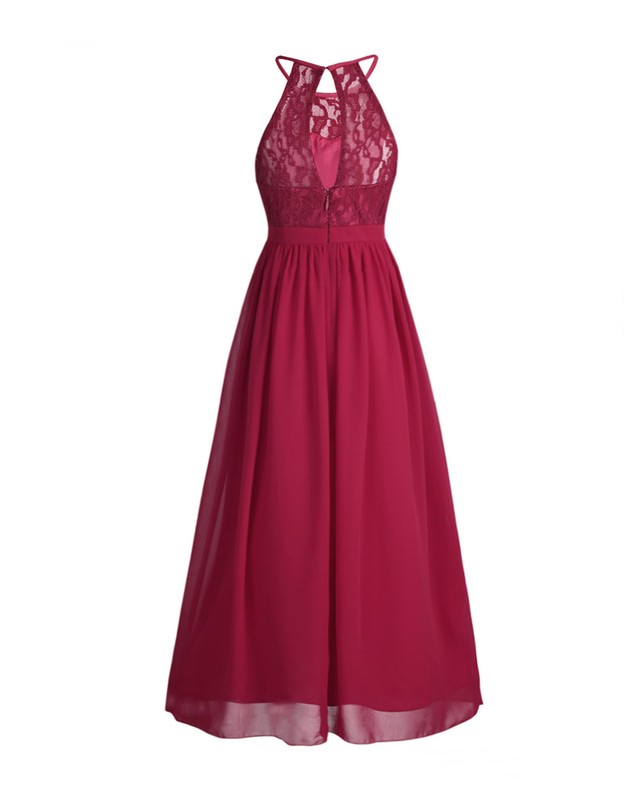 Sleeveless, halter neck with clasp at back, floral lace top bodice, high-waisted design, hollow out back with hidden back zipper closure.