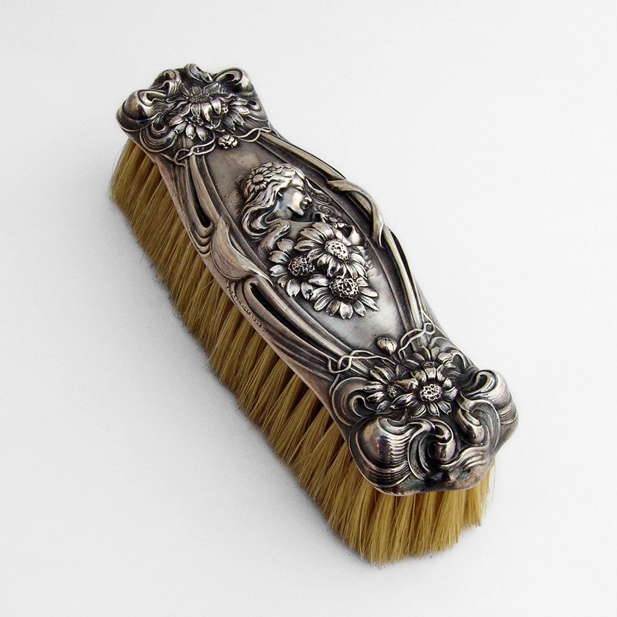 Unger Brothers sterling silver small clothes brush in the high relief He Loves Me pattern, featuring Art Nouveau designs, patented Feb. 10th, 1903.