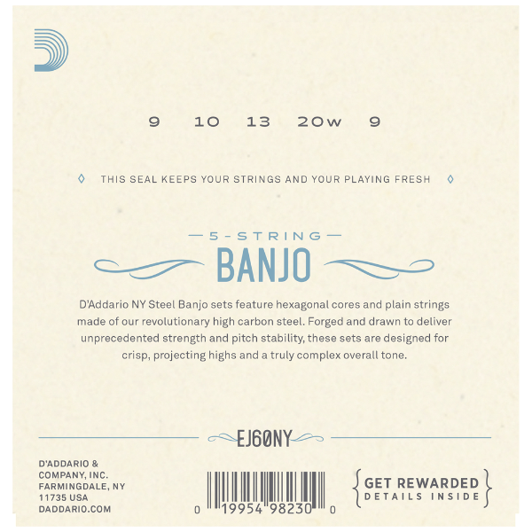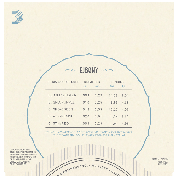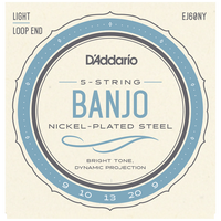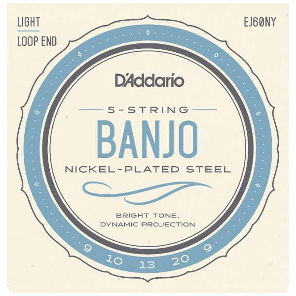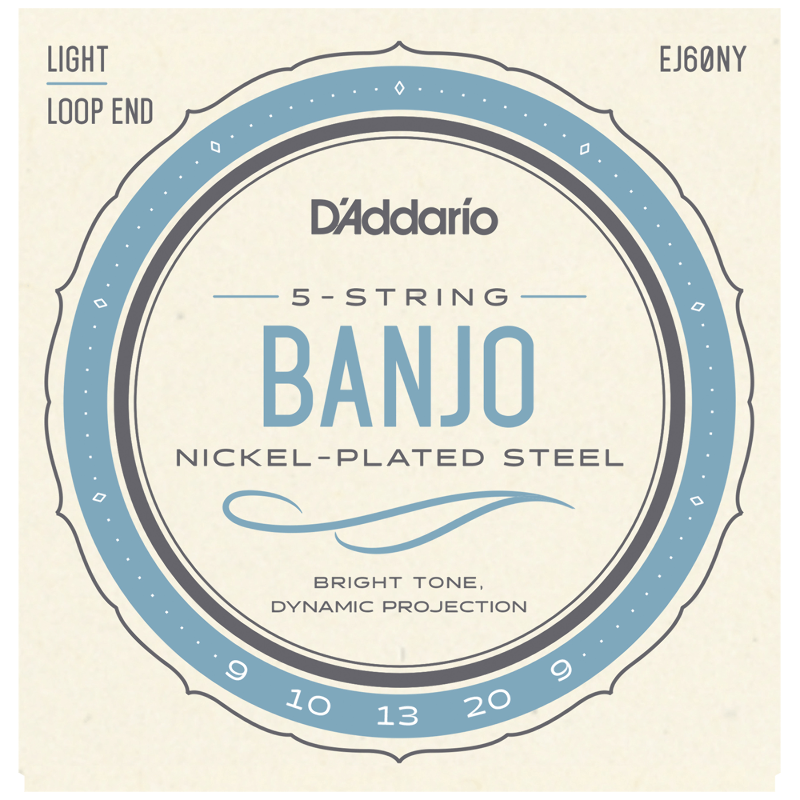 EJ60, one D'Addario's best selling 5-string banjo sets, offers light playing tension for comfortable playing feel and brilliant tone. Loopend construction for universal fit.