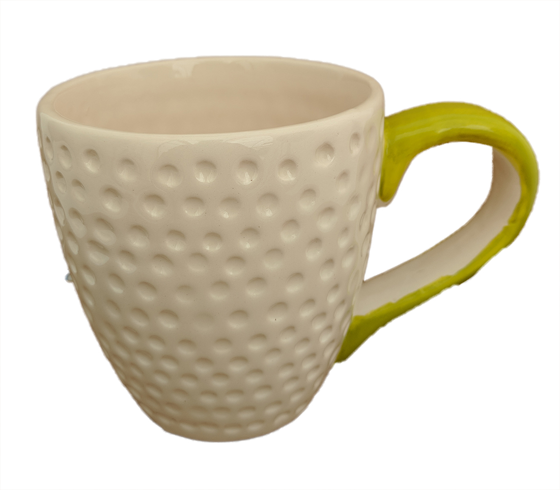 A glazed ceramic sports mug. Perfect for almost all house plants. Also great for succulents. Hand-painted ceramic white mug with dimples to resemble a golf ball. 13 ounce