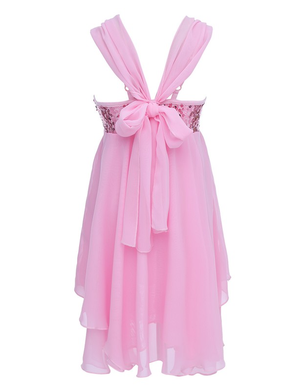 Hidden back hip zipper closure. 2 layers dress, top chiffon layer with 1 lining. Beautiful and stylish dress for your girl.