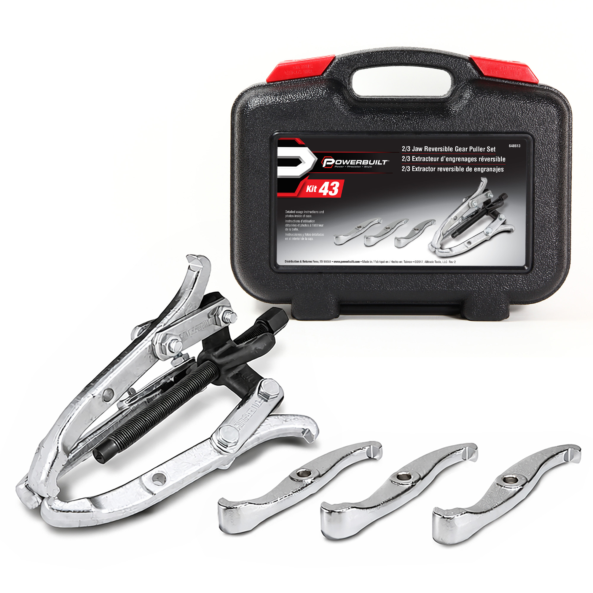 Need to service a stuck gear or a stubborn pulley? Remove them easily with the 2/3 Jaw Gear Puller Set. This set is designed for versatility and durability with its 4-inch and 6-inch reversible jaws for 2 jaw or 3 jaw set-up that can be used for both inside or outside pulls. It has a 4-ton capacity due to its robust chrome vanadium steel yoke and jaws. The specially designed fine thread center bolt allows for maximum torque with minimal effort. Perfect for dependable home use and built tough enough for the professional shop. Keep your kit well organized and protected for years of use in the heavy-duty carry case. Helpful detailed instructions and usage photos are included.