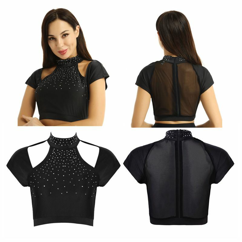 Women’s elegant shiny rhinestones dance crop top, back zipper closure.